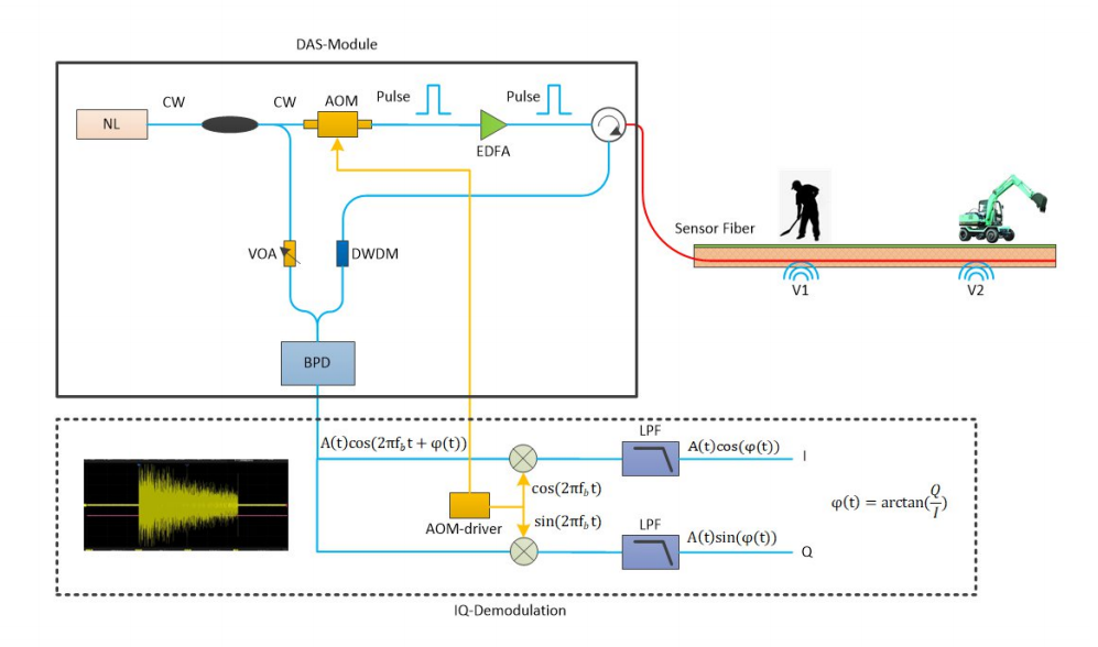 分布式光纖振動(dòng)聲波監測系統(DAS)是基于瑞利散射效應、光時(shí)域反射技術(shù)原理,集成光學(xué)、電子、機械和軟件算法等組成的復雜系統,是最新一代分布式光纖傳感技術(shù)的產(chǎn)品。該系統采用單模光纖,光纖既是傳輸介質(zhì),又是傳感元件。將光纜敷設于待測體上,即可實(shí)時(shí)獲得光纖上每一點(diǎn)的振動(dòng)信息,實(shí)現超長(cháng)距離的連續在線(xiàn)監測與精確定位。
